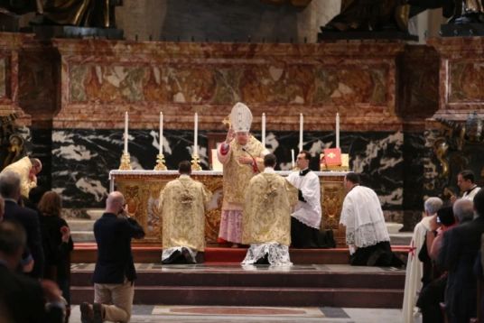 Đức Hồng Y Raymond Burke ban phước lành cuối cùng trong Thánh lễ hành hương Summorum Pontificum tại Rome vào ngày 25 tháng 10 năm 2014. | Tín dụng: Daniel Ibanez/CNA