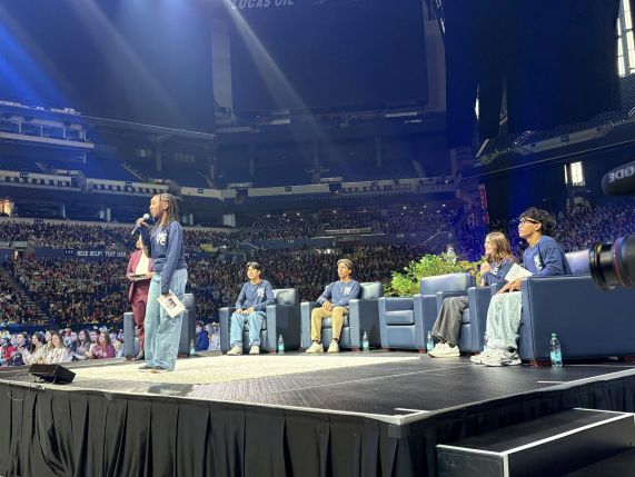 Giới trẻ đặt câu hỏi cho Đức Giáo Hoàng Lêô XIV trong buổi đối thoại trực tiếp vào ngày 21 tháng 11 năm 2025, tại Hội nghị Giới trẻ Công Giáo Quốc gia ở Indianapolis. | Ảnh: Tessa Gervasini/CNA