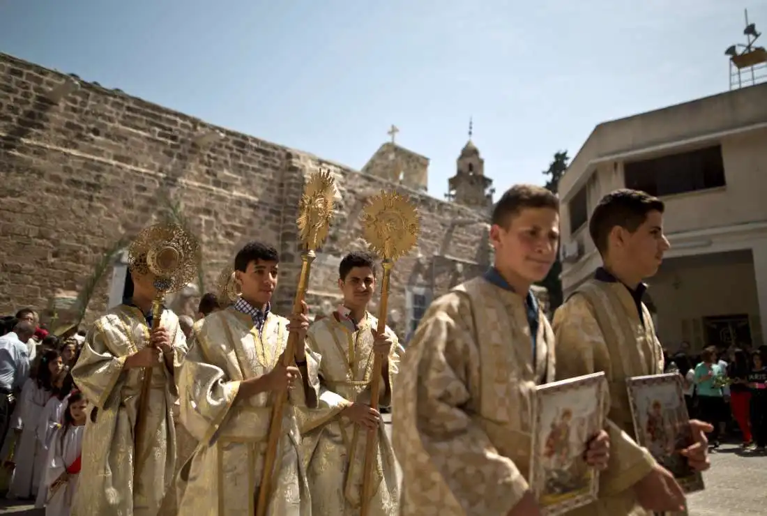 Giới trẻ người Palestine tham dự Chúa Nhật Lễ Lá của Chính thống giáo Hy Lạp tại Nhà thờ St.Porphyrios ở Gaza, vào ngày 24 tháng 4 năm 2016. (Ảnh: AFP)