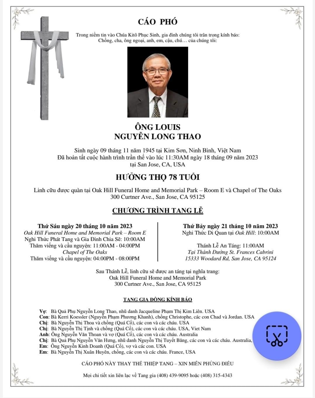 Cáo phó: Giáo Sư Louis Nguyễn Long Thao, Phó Giám đốc VietCatholic đã qua đời